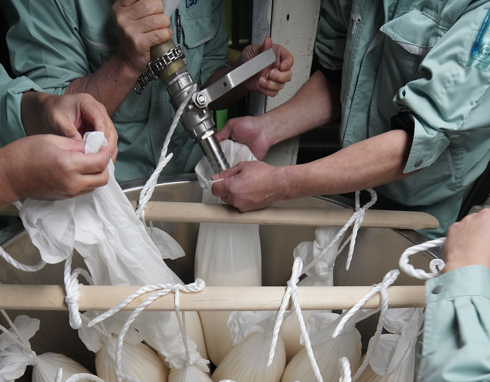 Nach der Fermentation wird die Maische gepresst (Shiboru). Für Premium-Sake kommen langsame Methoden wie Fune-shibori oder Fukuro-shibori zum Einsatz, bei denen der Sake über Stunden oder Tage schonend gewonnen wird.